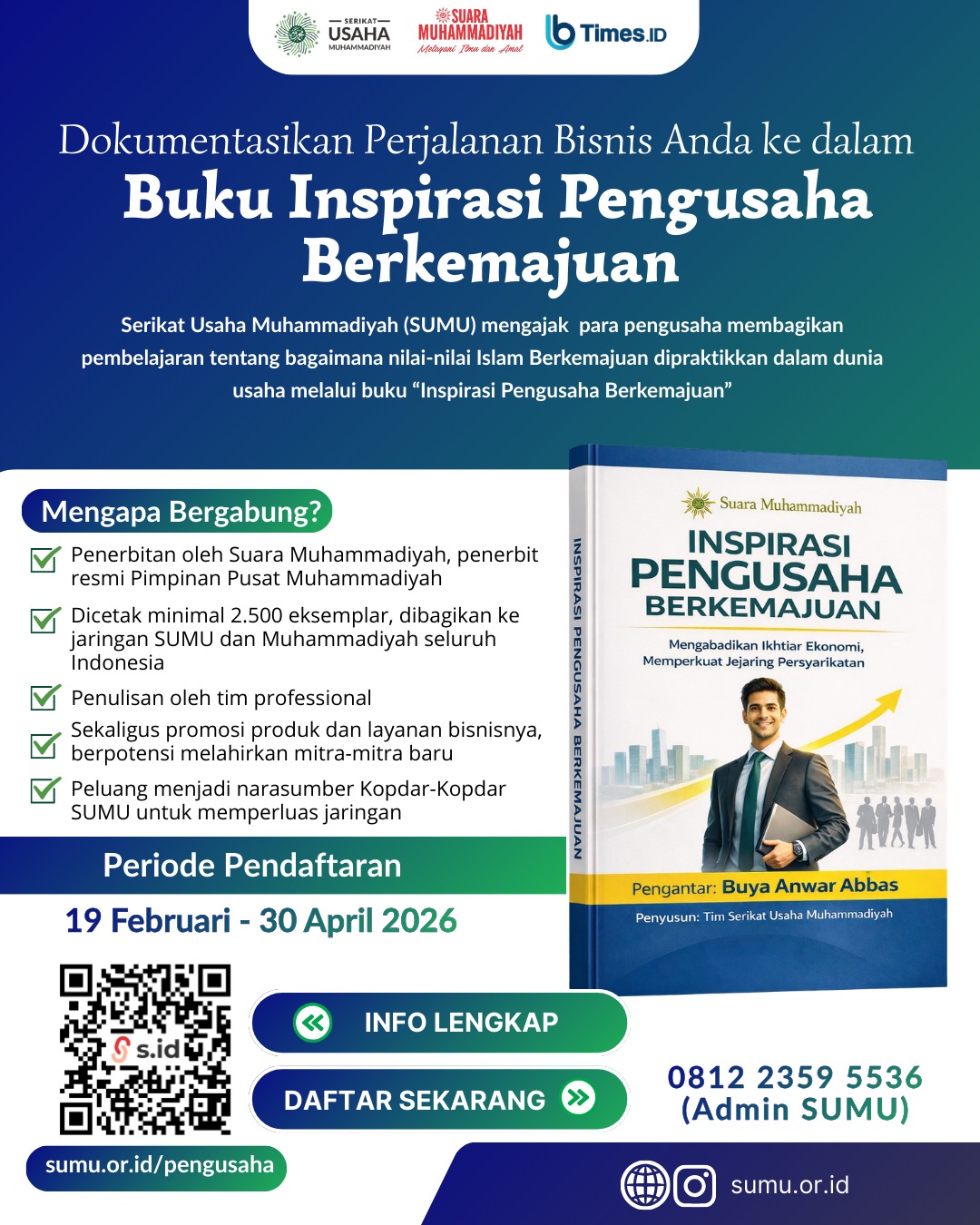 Bagikan perjalanan dan pengalaman bisnismu sebagai sumber inspirasi sekaligus membangun personal branding yang lebih kuat. Buku ini akan diterbitkan oleh media resmi persyarikatan (Suara Muhammadiyah) dan disebarluaskan melalui jaringan SUMU serta warga Muhammadiyah di seluruh Indonesia.